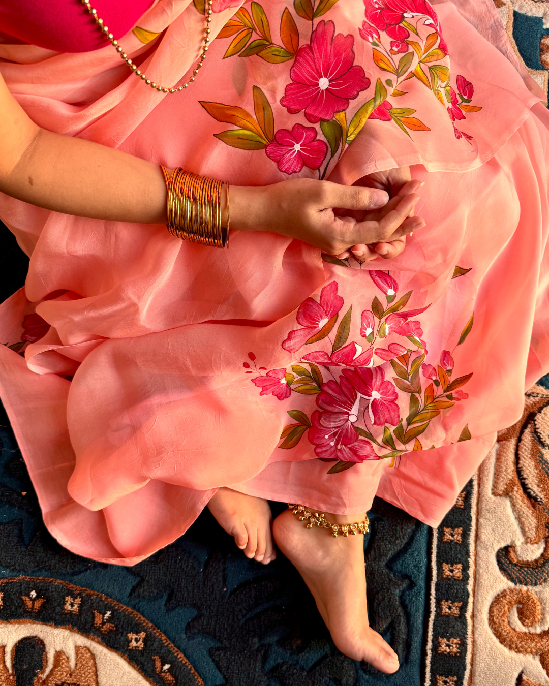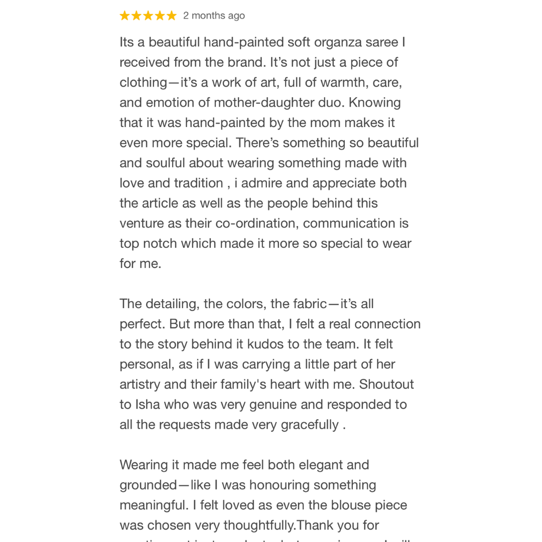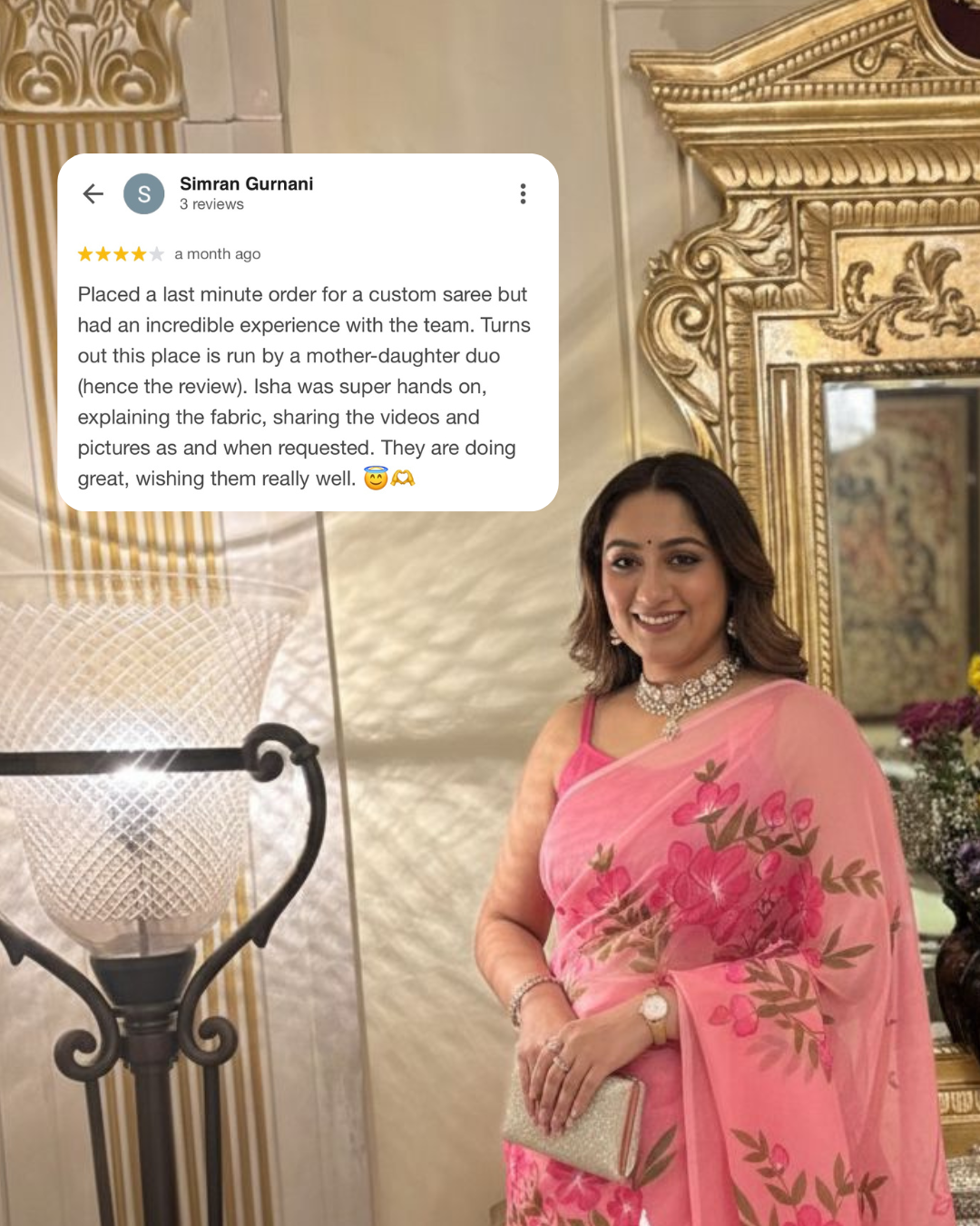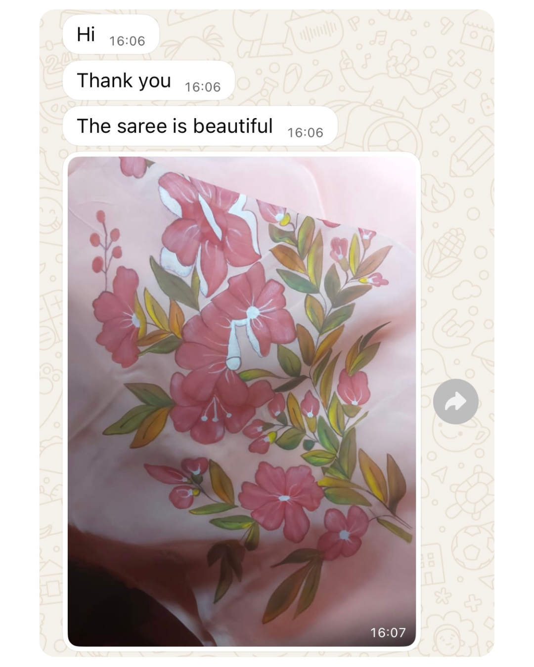 years passed by before she found her calling in this small venture; when she hand-painted an organza silk saree for her upcoming kitty party and got two random women enquiring about it when they found it getting fall-finished at a local boutique.