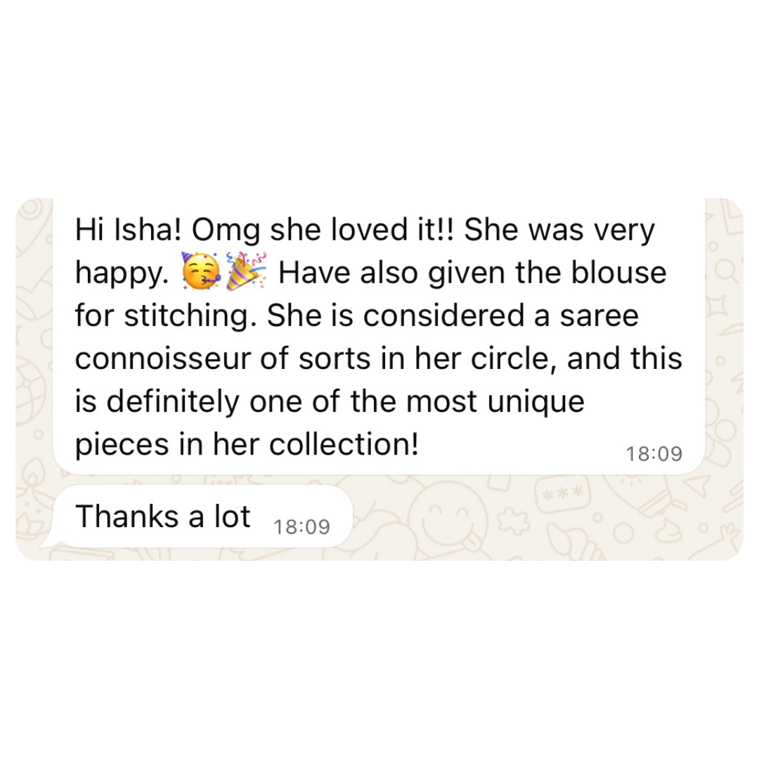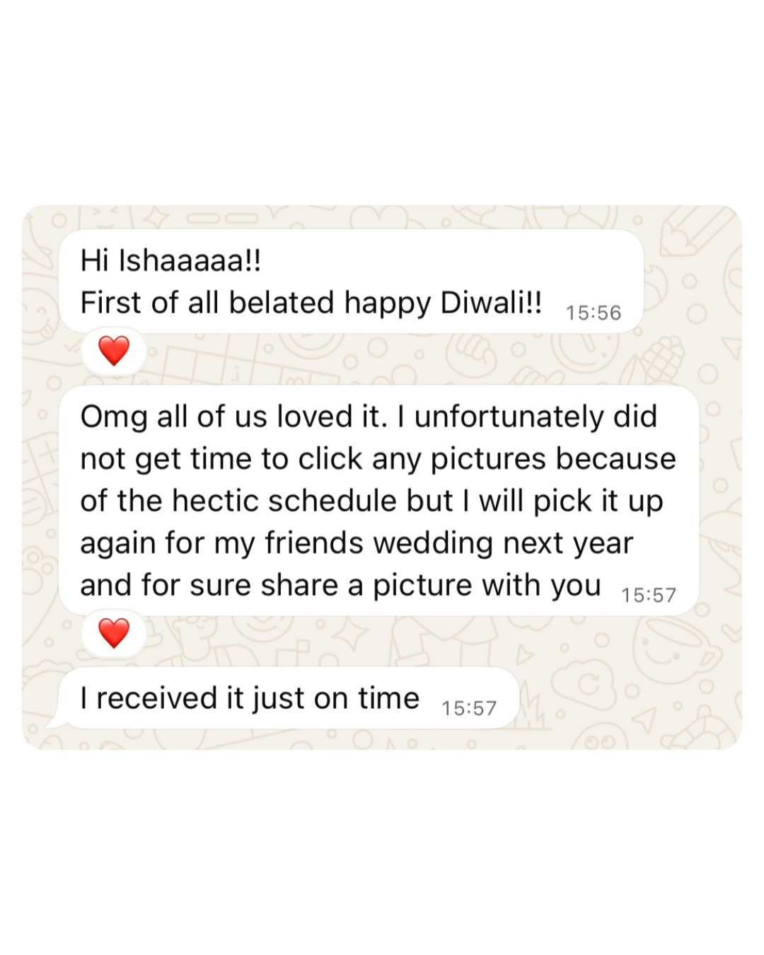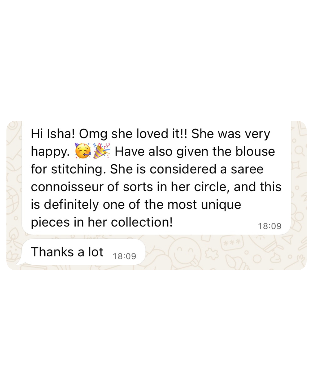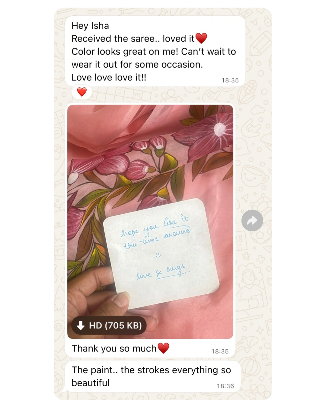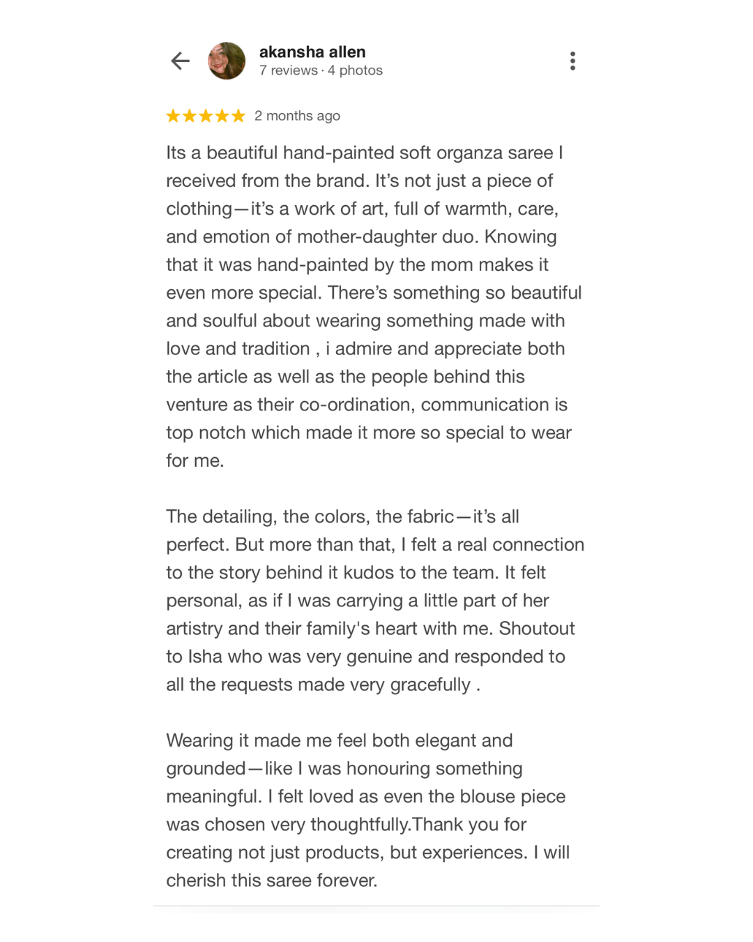 years passed by before she found her calling in this small venture; when she hand-painted an organza silk saree for her upcoming kitty party and got two random women enquiring about it when they found it getting fall-finished at a local boutique.