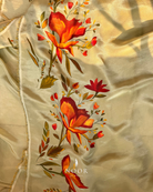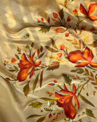 our hand painted gold-mint tissue 'gulmohar' saree with hand-painted bursts of bright gulmohars & hand-studded golden stones all over the saree ♥️